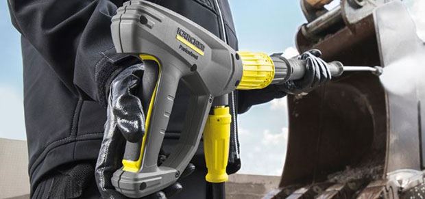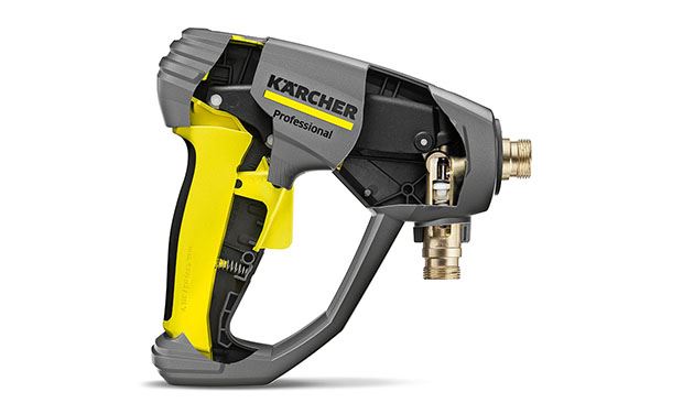 Der deutsche Hersteller Kärcher hat eine neue Pistole für Hochdruckreiniger entwickelt, mit der keine Haltekraft benötigt wird. Um den Wasserstrahl auszulösen drückt der Handballen den Auslösegriff im Gegensatz zu bisherigen Systemen in Richtung Pistolenhaltegriff.
