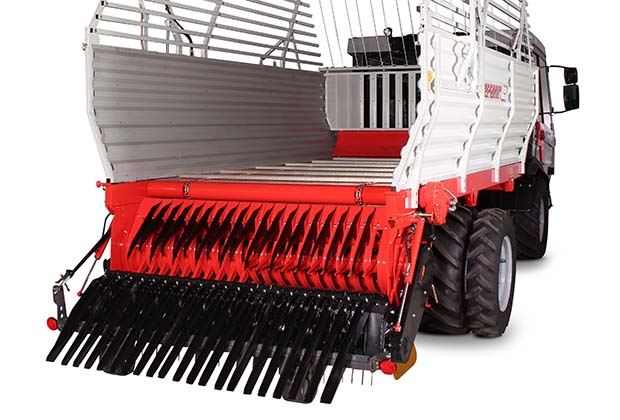 Zudem wird mit der Hecktüre für die Entladung zusätzlich auch das Querrohr hydraulisch angehoben. Dadurch rutscht das Futter ungehindert aus dem Laderaum. Für einen geringen Wartungsaufwand soll das Förderaggregat mit einer optionalen Zentralschmierung und einer automatischen Kettenschmierung verfügbar sein. Das Schnellkuppelsystem und die Laufruhe beim Laden wurden beibehalten.