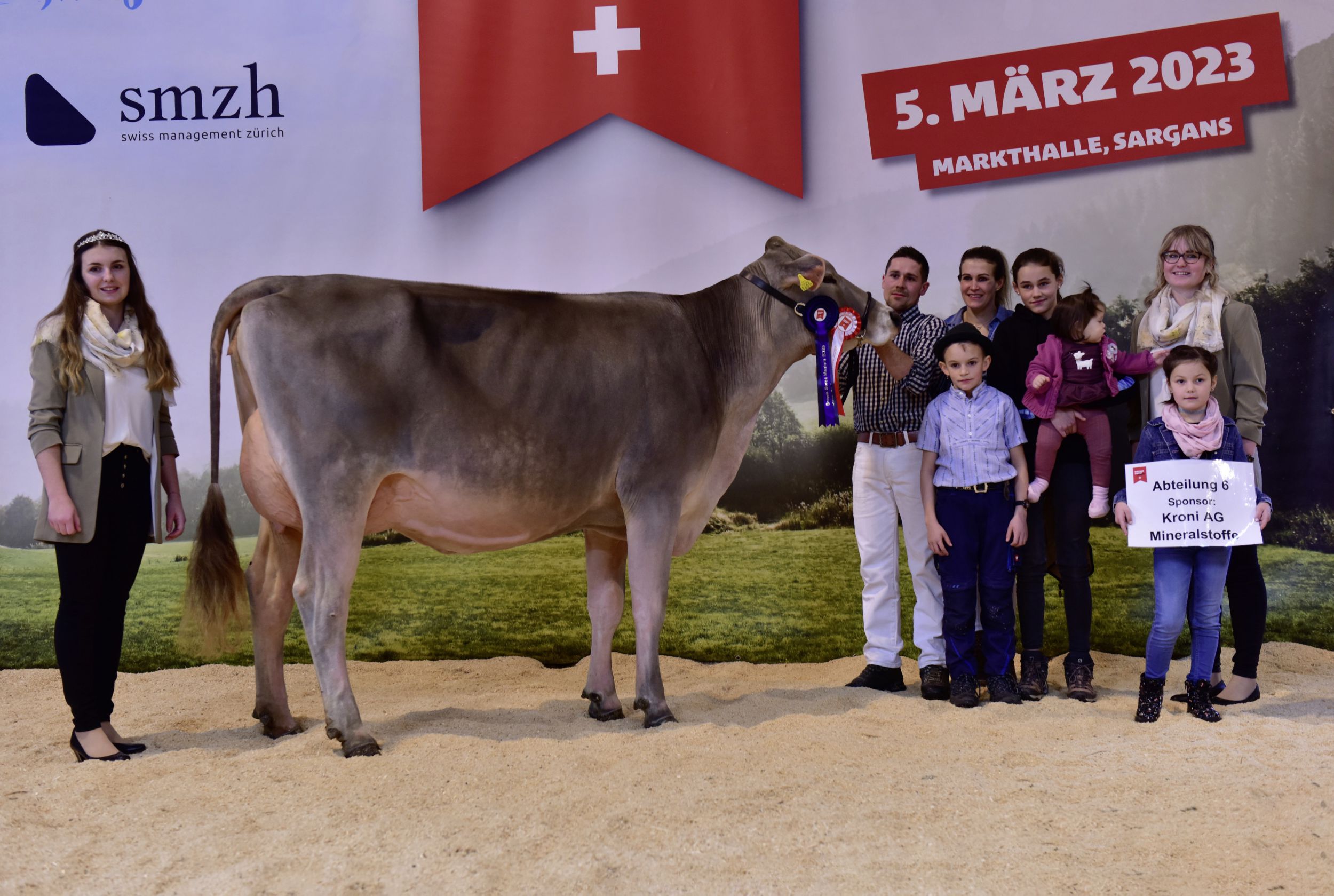 Nach 10 Abteilungen mit BS-Erstmelkkühen aus 15 verschiedenen Kantonen kam es in der Markthalle Sargans zur grossen Championwahl. Diese wurde von Mäderhof’s Holdrio Bianca von Kevin Züger aus Vorderthal SZ gewonnen. Die sehr harmonische Bianca schlug wegen der besseren Rippenstruktur die Holdrio-Tochter Jamaica von Christian Schneider aus Schwendi SG. Klocker lobte die Ausgeglichenheit von Jamaica und erwähnte dabei das Topeuter und das feine Fundament. Die Ehrenerwähnung ging an Dolf BS Silverstar Tracy ebenfalls aus dem Stall Züger. Bereits in der Abteilung lieferten sich die beiden Zügerkühe einen Schlagabtausch. Die bessere Beckenneigung und Vorteile im Mastdarm und in der oberen Linie gaben den Ausschlag zu Gunsten von Bianca.