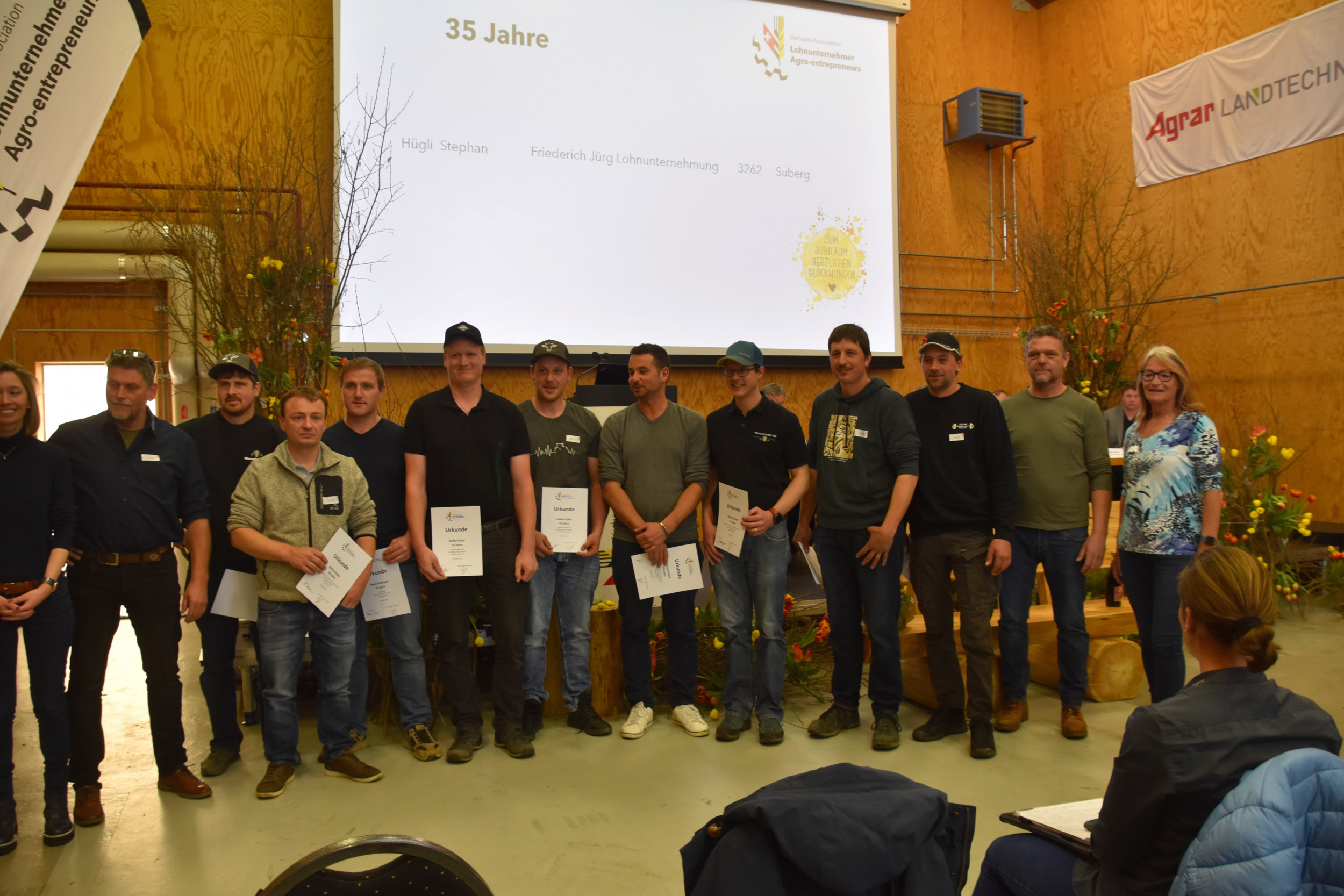 10 Jahre: Adrian Haller, R. + M. Haller GmbH, Birrhard AG; Beat Hofmann, Hirter & Tschanz AG, Safenwil AG; Fabian Kuhn, Bolliger Agrar-Dienste, Schmiedrued AG; Fabian Rieser, Wiesendanger AG, Ossingen ZH; Stefan Suter, Bolliger Agrar-Dienste, Schmiedrued AG. 15 Jahre: Simon Häfeli, Rübenumschlag Mittelland, Wildegg AG; Michel Haupt, Wiesendanger AG, Ossingen ZH; Rafael Sutter, Pflanzenbauservice GmbH, Oberramsern SO; 20 Jahre: Daniel Kunz, Leu AG Lohnunternehmen, Hohenrain LU; Felix Suter, Lohnbetrieb Hansjörg Brütsch, Ramsen SH. 25 Jahre: Angie Staub, Heussi Landw. Dienstleistungen, Donzhausen TG; 35 Jahre: Stephan Hügli. Jürg Friederich Lohnunternehmung, Suberg BE. sal