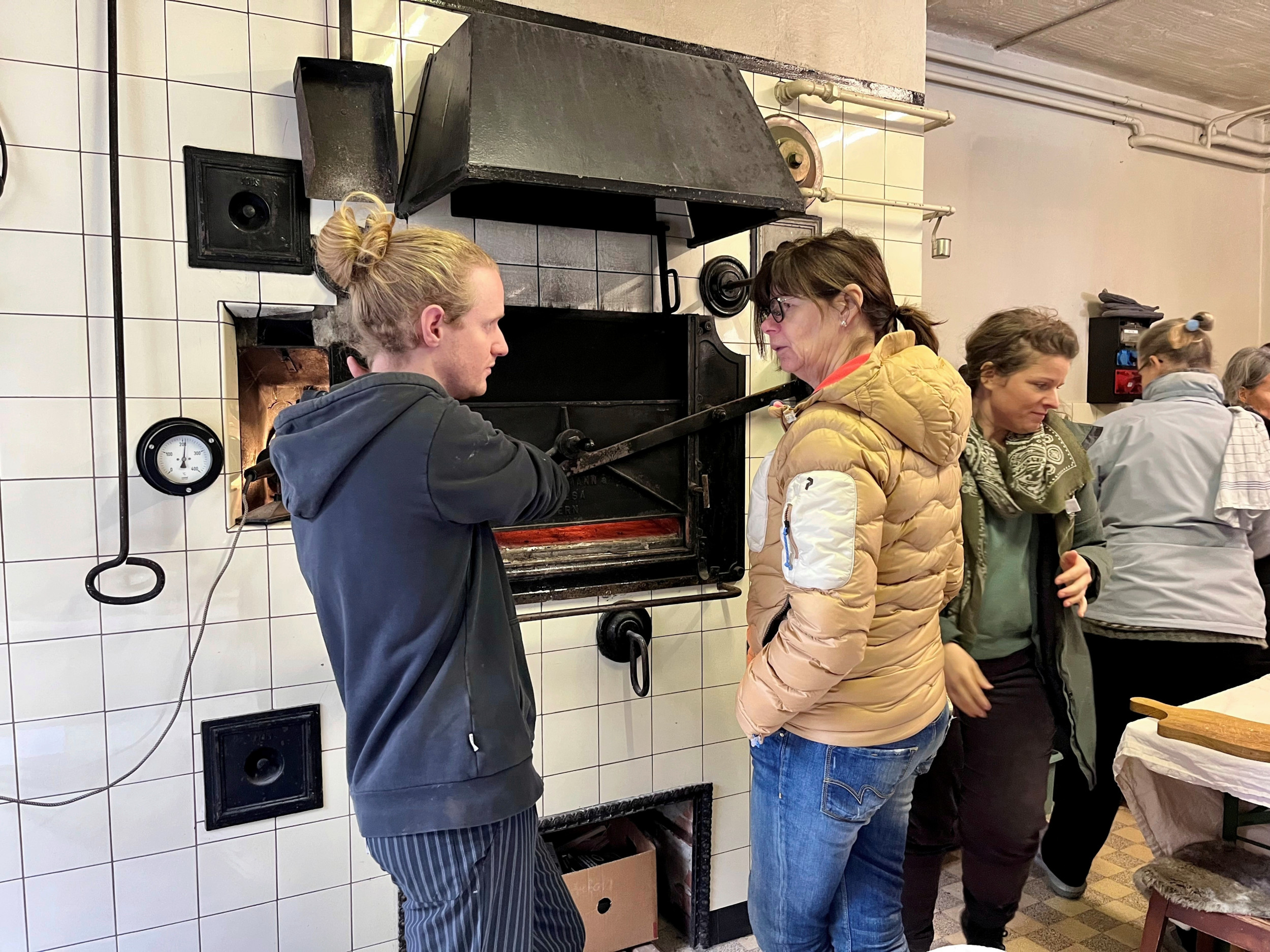 Nach der Pause geht es praktischer zu. Im Brotbackhäuschen lernen die Teilnehmerinnen und Teilnehmer unter Anleitung von Dominik Wyss, Bäcker und Holzofenspezialist, sowie Brigitte Reinmann, Hauswirtschaftslehrerin an der Bäuerinnenschule, wie man aus Korn hochwertiges Brot im Holzofen zubereitet. Bald wird geschnippelt, abgewaschen und gekocht.