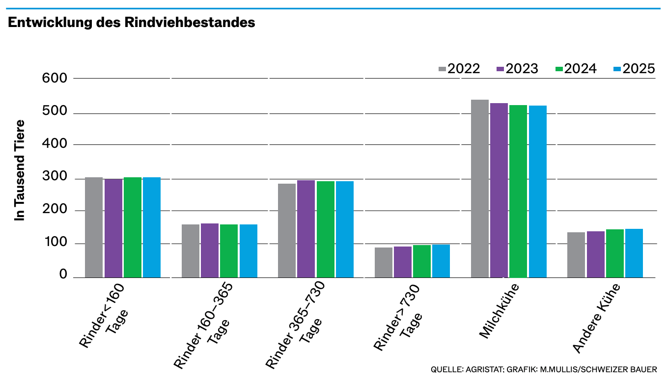 Der Rindviehbestand blieb in den letzten fünf Jahren ziemlich stabil. Dies deshalb, weil viele Tiere aufgrund der Verlagerung von der Kälbermast zur Grossviehmast länger im Bestand bleiben. So nahm die Zahl der männlichen Kälber, die weniger als 160 Tage alt sind und vor allem in der Kälbermast eingesetzt werden, 2025 im Vergleich zum Vorjahr um rund 5’000 Tiere oder 3,7 Prozent ab, während die Zahl der männlichen Tiere, die älter als 160 Tage und für die Grossviehmast bestimmt sind, um 2’200 Stück oder 2,1 Prozent zunahm.