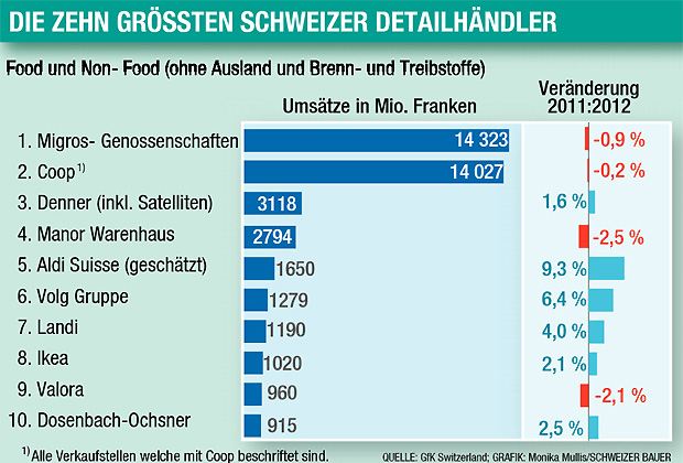 Die Umsatzentwicklungen der letzten Monate widerspiegeln die angespannte Situation im Schweizer Handel. Preiskämpfe und Rabattschlachten zeigten die Nervosität einzelner Händler, teilte GfK Switzerland mit. Migros und Coop dominieren weiterhin den Schweizer Detailhandel. An 3. Stelle folgt Denner vor Manor. Aldi Suisse hat es auf den 5. Rang geschafft, dies innert sieben Jahren seit dem Markteintritt in die Schweiz. Landi erreicht mit einem Plus von 4% den 7. Rang vor Ikea, die erstmals die Milliardengrenze erreichte. Neu in den Top 10 ist die Dosenbach-Ochsner-Gruppe.