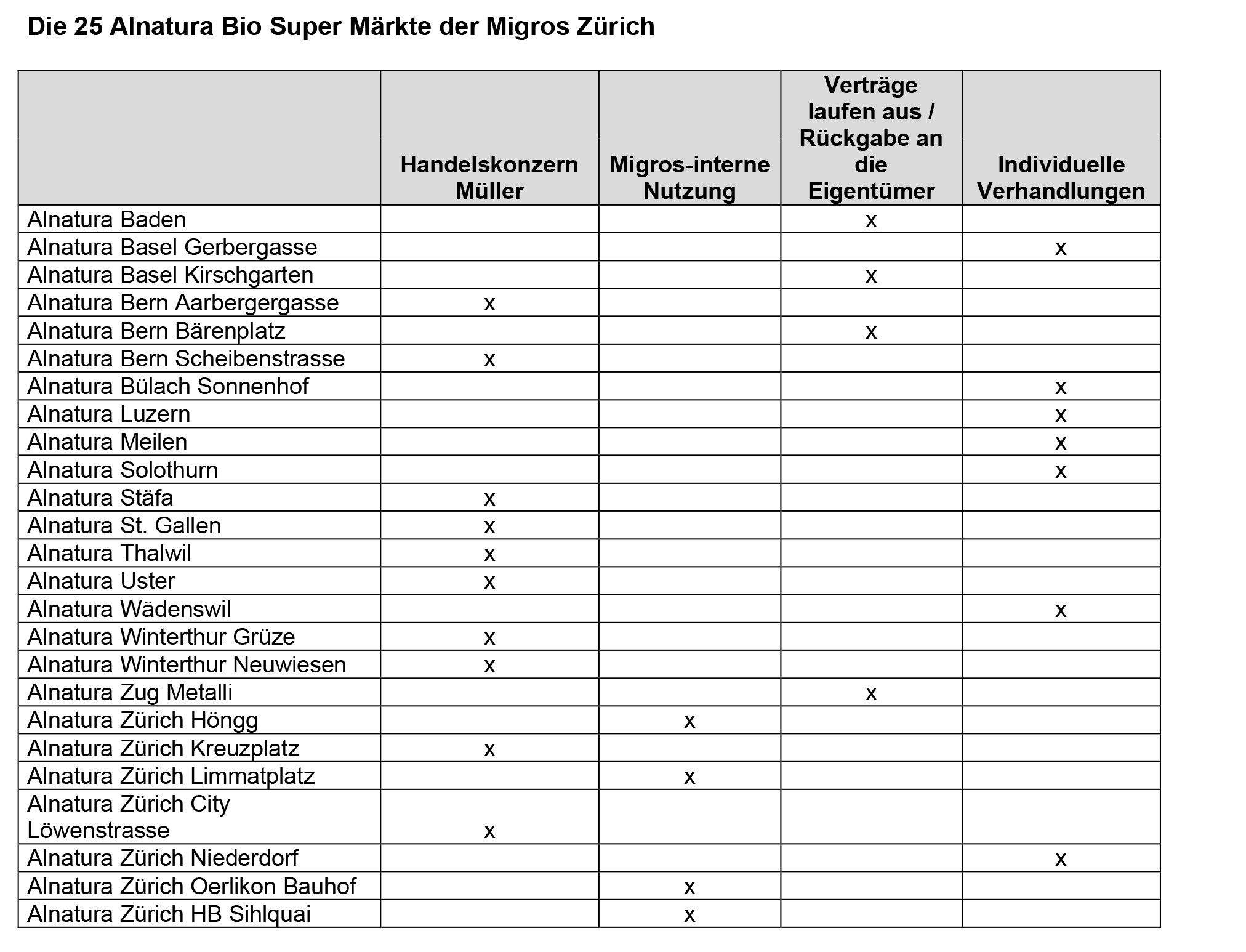 Vier Alnatura-Standorte wird der Detailhändler selbst weiternutzen, wie die Migros Zürich am Donnerstag mitteilte. Bei vier weiteren Verkaufsflächen liefen die Mietverträge aus und sie würden an die Eigentümer retourniert. Für die restlichen sieben Filialen liefen noch Verhandlungen über die künftige Nutzung.
