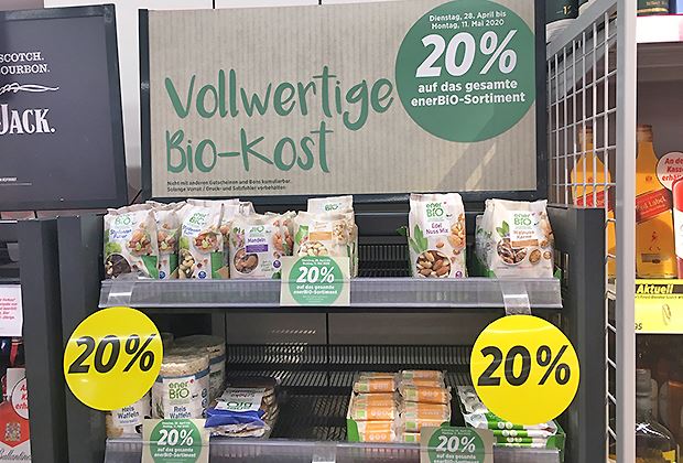 Ein aktuelles Beispiel für Import-Bio bietet sich einem beim Besuch eines Denner-Supermarktes. Dort fielen vergangene Woche an der Decke hängende Schilder ins Auge: «20% auf das gesamte EnerBio-Sortiment, vom 28. April bis 11. Mai 2020». Wer dann bei der Kasse warten muss, tut dies neben einem eigens hingestellten Gestell voller «EnerBio»-Waren: Mandeldrink, Haferflocken, Vollkornspaghetti, Cashew-Nüsse, Zitronensaft, Olivenöl, Pesto rosso und einige andere mehr.