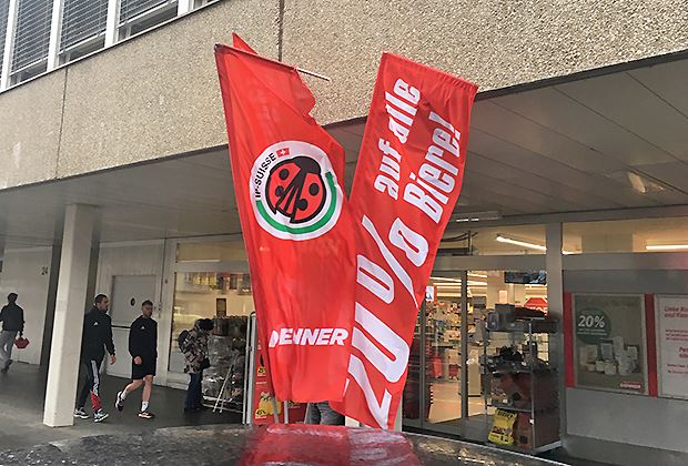 In der Tat: Noch vor dem Betreten des Denner-Ladens fällt die Fahne mit dem bekannten Käfer-Logo ins Auge. Seit dem Jahr 2016 spannt IP-Suisse mit Denner zusammen. Für die fast 20'000 Bauern ist das auch darum wertvoll, weil Denner in der Kommunikation mit dem Käfer-Logo wirbt, das der IP-Suisse gehört.