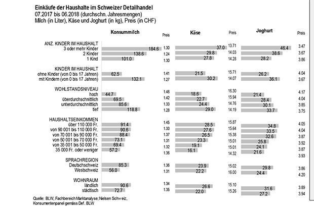 Gemäss einer Mitteilung des Fachbereichs Marktanalyse des BLW schwankt der Konsum von Milchprodukten nach Anzahl Personen in den Haushalten. Eine 12-Monats-Auswertung (Juli 2017 bis Juni 2018) des Haushaltspanels von Nielsen ergab, dass Haushalte mit drei oder mehr Kindern deutlich mehr und billigere Milchprodukte konsumieren, als jene mit einem Kind. Haushalte mit mehreren Kindern konsumierten im Berichtszeitraum 37 Kilo Käse (zu 13,71 Fr./kg) und Haushalte mit einem Kind hingegen 27,8 Kilo (zu 14,28 Fr./kg).