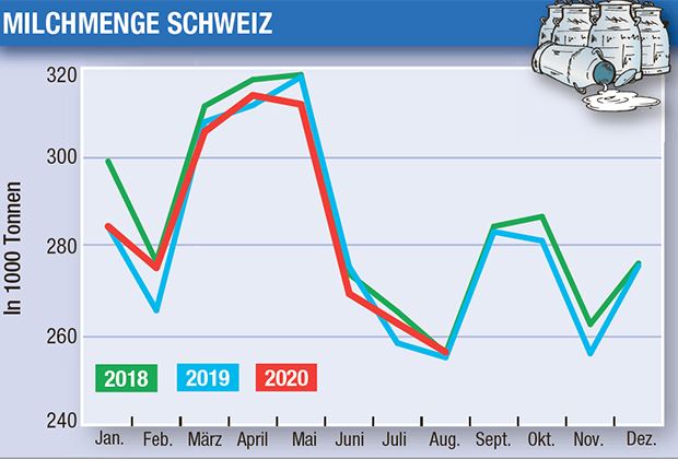 Erwähnenswert ist die diesjährig deutlich höhere Produktion von Konsummilch. Im Juli wurden 9,9% mehr produziert (35601 Tonnen) als im Juli 2019 (32398 Tonnen). Ende August waren 179 Tonnen Butter am Lager — ein absoluter Tiefstand für diese Jahreszeit. Bei den Marktkommentaren der Kälber war in den letzten Wochen und Monaten stets zu lesen: «Das kleine Angebot vermag die Nachfrage nicht zu decken».