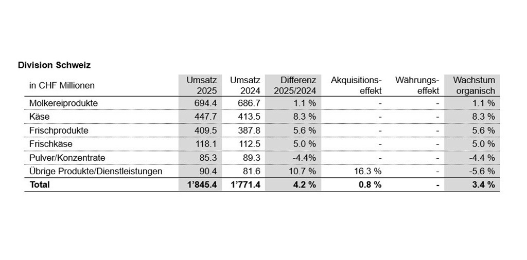 Auch die in den USA hergestellten Marken wie Athenos (Feta) und Meyenberg (Ziegenmilchprodukte) legten zu. Der Käseimport aus der Schweiz wurde hingegen von zoll- und wechselkursbedingten Preiserhöhungen beeinträchtigt. Die Division erreichte noch einen Anteil von 36,4 Prozent am Konzernumsatz (2024: 39,3 %).
