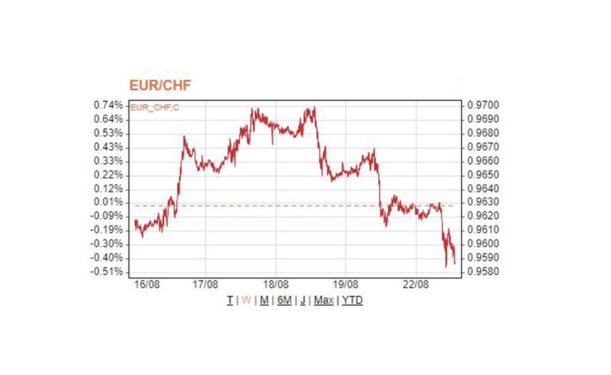 Am Montagmorgen notiert der Euro mit 0,95825 Franken so tief wie noch nie. Seit der unerwarteten Zinserhöhung der Schweizerischen Nationalbank (SNB) Mitte Juni hat der Euro mehr als sieben Prozent verloren.