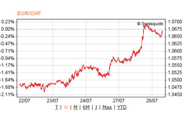 Am Dienstagmorgen lage der Kurs deutlich über der 1,06-Franken-Schwelle. Um 7.46 Uhr notierte dieser bei 1,0675 Fr.