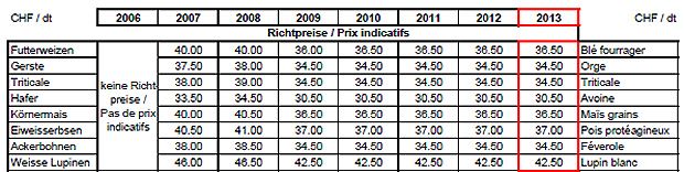 Die Kommission «Markt-Qualität Getreide» von Swiss Granum hat die Richtpreise für Futtergetreide und Eiweisspflanzen der Ernte 2013 festgelegt. Die Preise bleiben im Vergleich zum Vorjahr unverändert.
