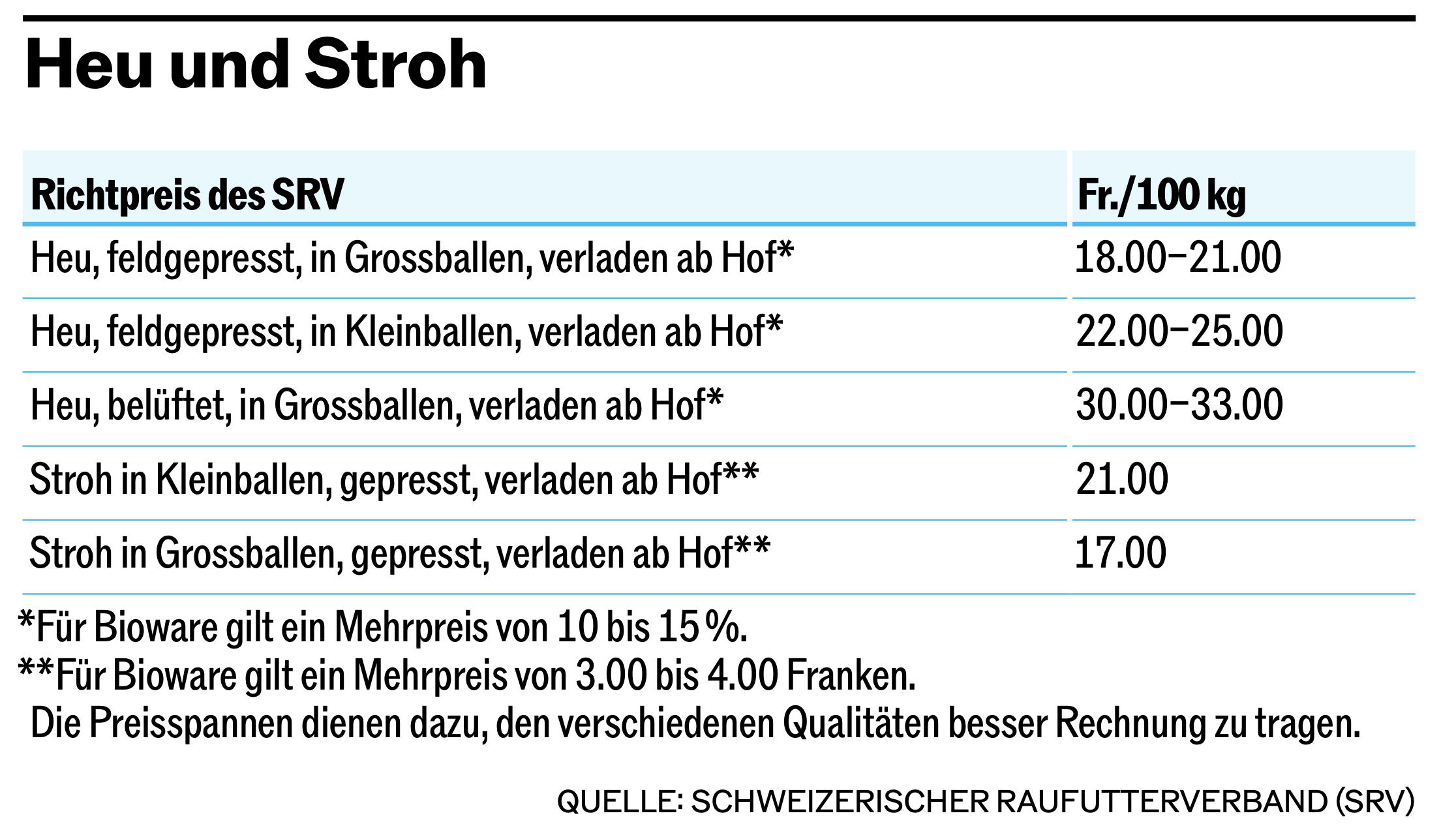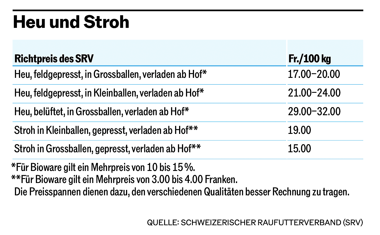 In Süddeutschland war auch die Heuernte 2025 generell gut bis sehr gut, und weil der Heumarkt relativ ruhig war, gab es bis in den Winter hinein günstige Preise. In Norddeutschland ist der Raufuttermarkt etwas zurückgegangen, weil die anspruchsvolle Kundschaft mehr süddeutsche Ware gekauft hat, die allerdings auch einiges teurer ist. Der Schweizerische Raufutterverband ist verpflichtet, Richtpreise für den Schweizer Markt abzugeben, die allerdings keine Endverbraucherpreise, sondern nur Orientierungswerte für den Handel sind.