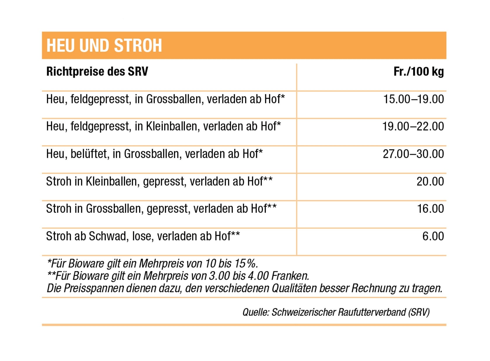 Beim Heumarkt stellte der Vorstand den Antrag, den Richtpreis wegen der guten Qualität um einen Franken anzuheben. Der Vorschlag wurde mit grossem Mehr angenommen. Die neuen Preise pro Dezitonne Heu: stockbelüftet in Grossballen, gepresst, verladen ab Hof, 30 bis 33 Franken; feldgepresst in Grossballen, verladen ab Hof, 18 bis 21 Franken; feldgepresstes Heu in Kleinballen, verladen ab Hof, 22 bis 25 Franken. Für biozertifiziertes Heu wird ein Zuschlag von 10 bis 15 Prozent berechnet. Posten, die vom Handel eingelagert werden müssen, werden diese Richtpreise allenfalls nicht erzielen.