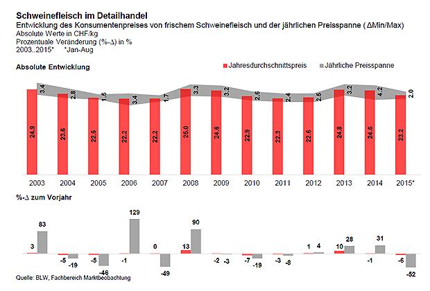 Zwischen 2003 und 2015 wurden die jährlichen Durchschnittspreise von frischem Schweinefleisch im Detailhandel mit dessen Preisspanne (Differenz zwischen dem tiefsten und höchsten Monatspreis) verglichen, wie aus dem aktuellen Marktbericht des Fachbereichs Marktbeobachtung beim BLW hervorgeht.