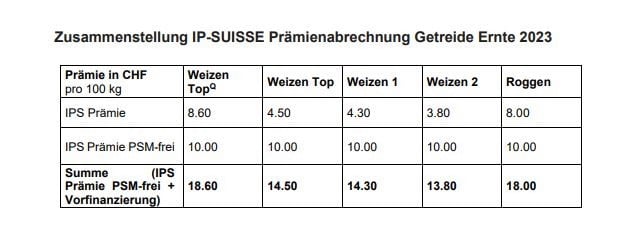 Die Erntemenge 2023 bewegt sich gemäss IP-Suisse auf einem durchschnittlichen Niveau. Gestiegen im Vergleich zum Vorjahr ist die Fläche von Getreide ohne Pflanzenschutzmittel. Für diese Mengen wurde wiederum eine Zusatzprämie von 10.00 Fr./100 kg ausbezahlt. Bei den Klasse Top-Q-Sorten (Runal, Piz Nair, Titlis), die pflanzenschutzmittelfrei angebaut werden können, wird eine Prämie von 18.60 Fr. entrichtet.