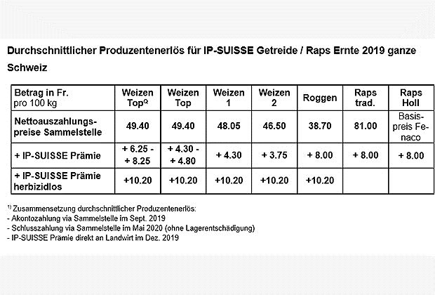 Die Nettoauszahlungspreise der Ernte 2019 liegen auf dem Niveau des Vorjahres. Bei «Weizen TopQ» lag der Nettoauszahlungspreis bei 49.40 Fr./100 kg. Auch beim «Weizen Top» lag der Auszahlungspreis mit 49.40 Fr./100 kg auf dem Vorjahresniveau. Auch beim «Weizen 1» «Weizen 2» und beim Roggen wurden dieselben durchschnittlichen Auszahlungspreise erreicht. Der Auszahlungspreis beim Raps stieg um 1 Franken mit 81 Fr./100 kg. Bei den angegebenen Preisen handelt es sich um die gesamtschweizerischen Durchschnittspreise, die an die Sammelstellen bezahlt werden.