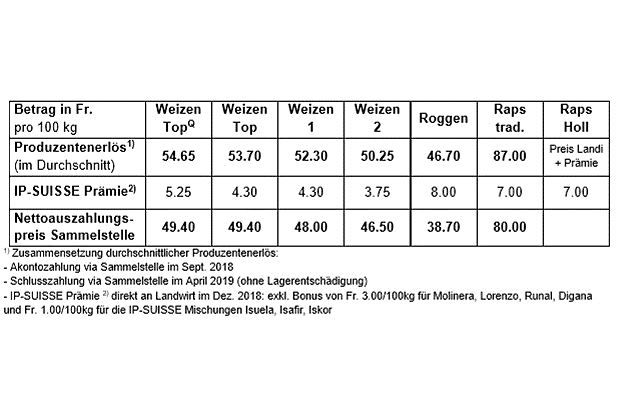 Die Produzentenpreise der Ernte 2018 liegen aber leicht unter jenen vom Vorjahr. Bei «Weizen TopQ» lag der Nettoauszahlungspreis bei 49.40 Fr./100 kg, das sind 1.20 Fr. weniger als im Vorjahr. Auch beim «Weizen Top» sank der Auszahlungspreis um 1.20 Fr. pro 100 Kilo. Beim «Weizen 1» «Weizen 2» sind die Auszahlungspreise 1.30 Fr./100 kg tiefer. Das grösste Minus wurde beim Roggen mit -1.80 Fr./100 kg registriert. Der Auszahlungspreis beim Raps blieb mit 80 Fr./100 kg unverändert.