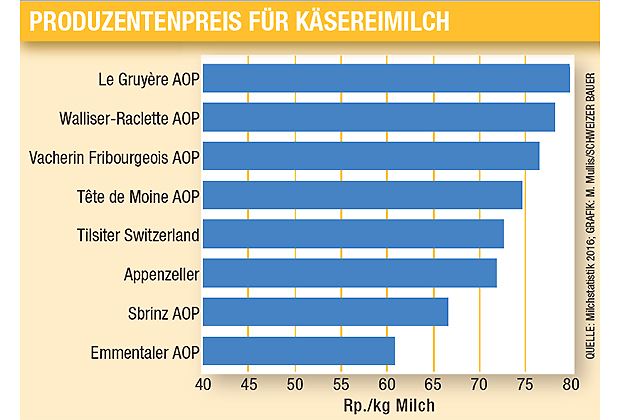 Ein Gruyère-AOP-Milchlieferant erhielt 2016 durchschnittlich 79,82 Rp./kg Milch netto ab Hof. Bei einem Emmentaler-AOP-Milchlieferanten betrug der Netto-Milchpreis im Schnitt 60,8 Rp./kg. Dies ist der Milchstatistik 2016 zu entnehmen. Die Milchpreise der übrigen Sortenkäse liegen irgendwo dazwischen.