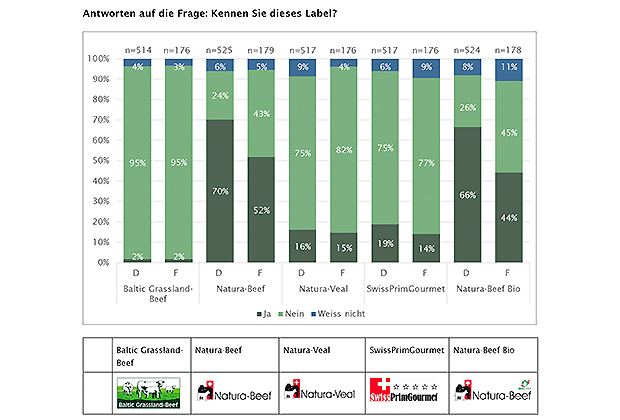 Die bekanntesten Labels gemäss der Studie sind Natura-Beef und Natura-Beef Bio (beide Coop). Sie erreichen besonders in der Deutschschweiz einen Bekanntheitsgrad. Gesamtschweizerisch liegen die Werte 61 respektive 55 Prozent. Eine tiefe Bekanntheit haben die Labels Natura-Veal und SwissPrimGourmet mit 16 respektive 17 Prozent. Praktisch unbekannt (2%) ist die Coop-Marke Baltic Grassland-Beef. Das Fleisch stammt von Rindern aus Estland, Lettland und Litauen. Vertrieben werden die Edelstücke in den Coop-Filialen. Die Detailhändlerin hat das Projekt auch ins Leben gerufen.