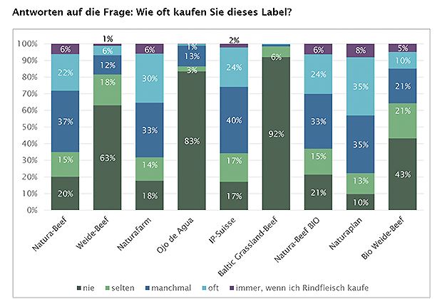 Der Bekanntheitsgrad wirkt sich wenig überraschend auf den Kaufentscheid aus. Bekanntere Labels werden häufiger gekauft. Am häufigsten gekauft werden Labels wie Natura-Beef, Bio Natura-Beef, Naturafarm, Naturaplan und IP-Suisse. Die Labels Weide-Beef und Bio Weide-Beef werden im Vergleich dazu weniger gekauft. Schwer auf dem Markt haben es die unbekannten oder Nischenlabels Ojo de Agua und Baltic Grassland-Beef.