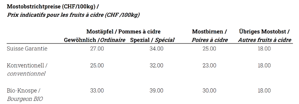 Die Forderungen der Produzenten wurden nicht vollumfänglich erfüllt. Sie wollten gemäss Verband eine Richtpreisanpassung von 2.00 Fr./100 kg bei den Mostäpfeln und 4.00 Fr./ 100 kg bei den Mostbirnen. Für Suisse-Garantie-Mostäpfel «gewöhnlich» gilt nun ein Preis von 27 Fr./100 kg, bei den Spezialmostäpfeln liegt der Richtpreis bei 34 Fr./100 kg. Für Bio-Äpfel «gewöhnlich» liegt der Richtpreis weiterhin bei 33 Fr./100 kg, für Mostäpfel «spezial» einer von 39 Fr./100 kg.