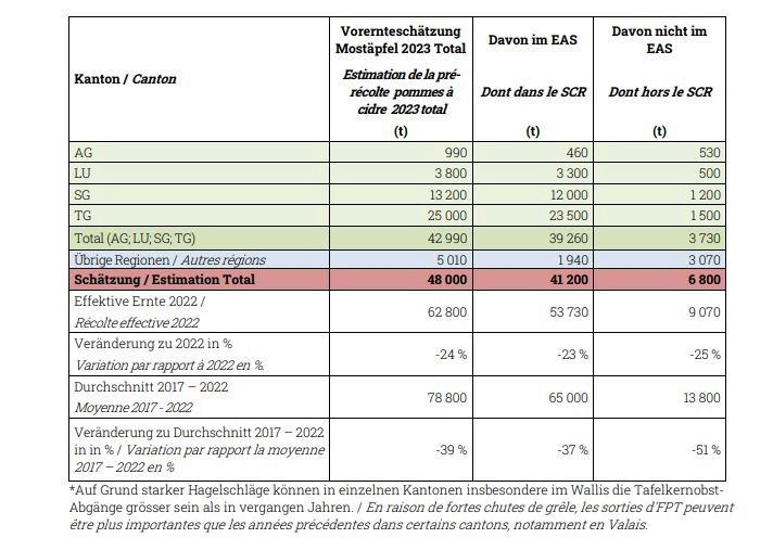 Die geschätzten Mengen liegen mit -39 Prozent bei den Mostäpfeln und -65 Prozent bei den Mostbirnen deutlich unter dem Durchschnitt der letzten sechs Jahre. Die Gründe für tiefe Erntemenge sind gemäss SOV der niederschlagsreiche und kalte Frühling und die dadurch verminderte Bestäubung sowie der trockene Juni, der den Junifall verstärkt hat.