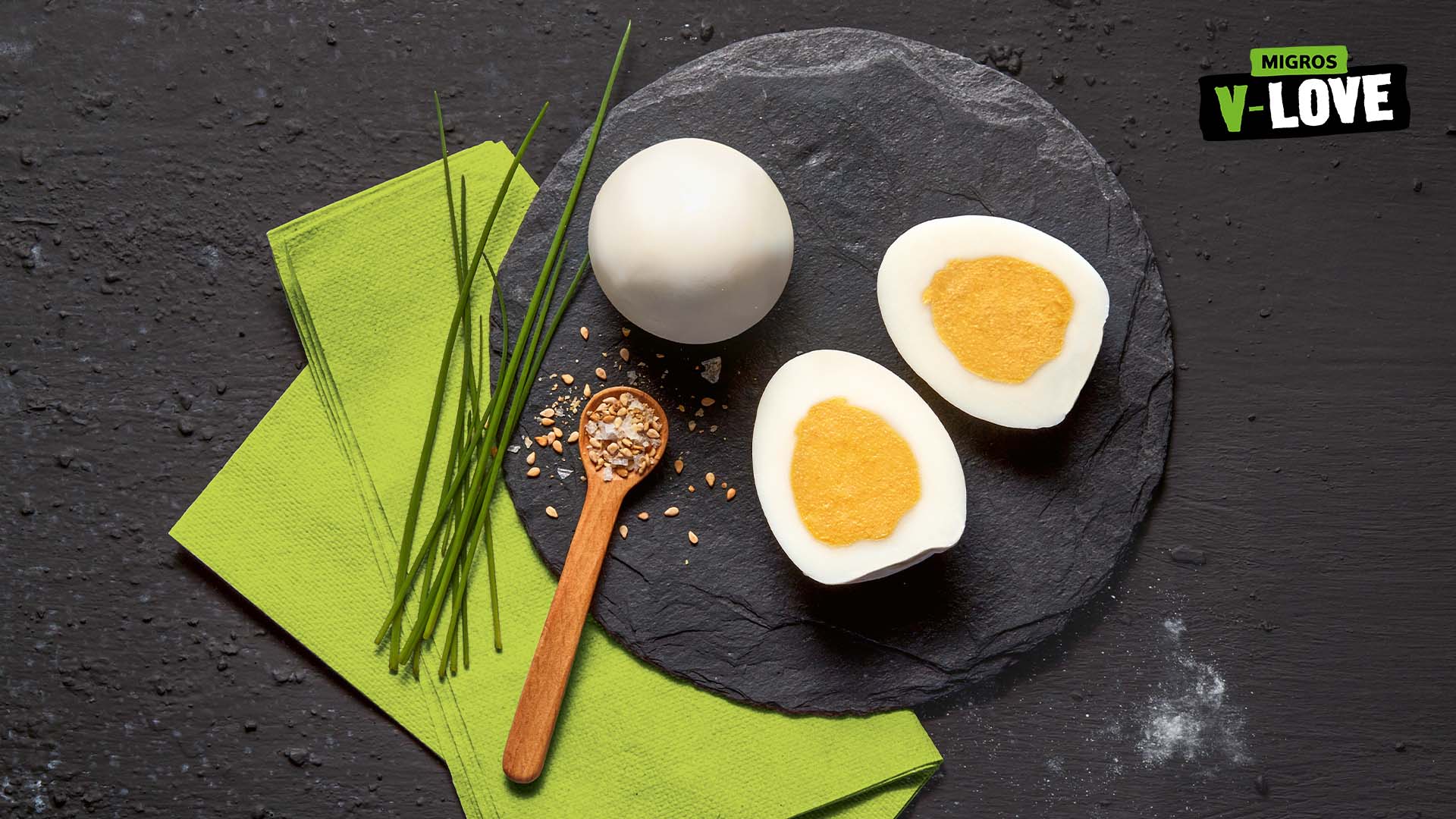 Die V-Love Marke der Migros hat neu ein hartgekochtes Ei aus Pflanzen im Angebot. Es ist weltweit das erste solche Produkt, wie die Migros am Freitag mitteilte.