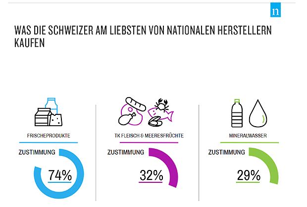 Jeder dritte (32 Prozent) legt bei tiefgekühltem Fleisch und Meeresfrüchten auf nationale Hersteller Wert. Zudem ergibt die Umfrage, dass die Konsumenten aus der Schweiz am liebsten in lokalen Läden einkaufen. Fast 70 Prozent der Konsumenten kaufen Obst und Gemüse in Geschäften in der Nähe ein. Bei frischem Fleisch, Fisch und Eiern sind es 54 Prozent und bei Backwaren 59 Prozent.