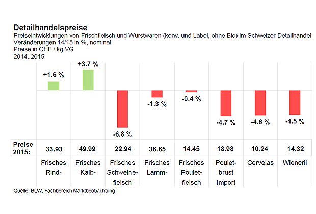 Die tiefen Produzentenpreise für Schweine haben sich auf den Detailhandel ausgewirkt. Schweinefleisch war 2015 deutlich günstiger als im Jahr zuvor. Rind und Kalb waren hingegen teurer.