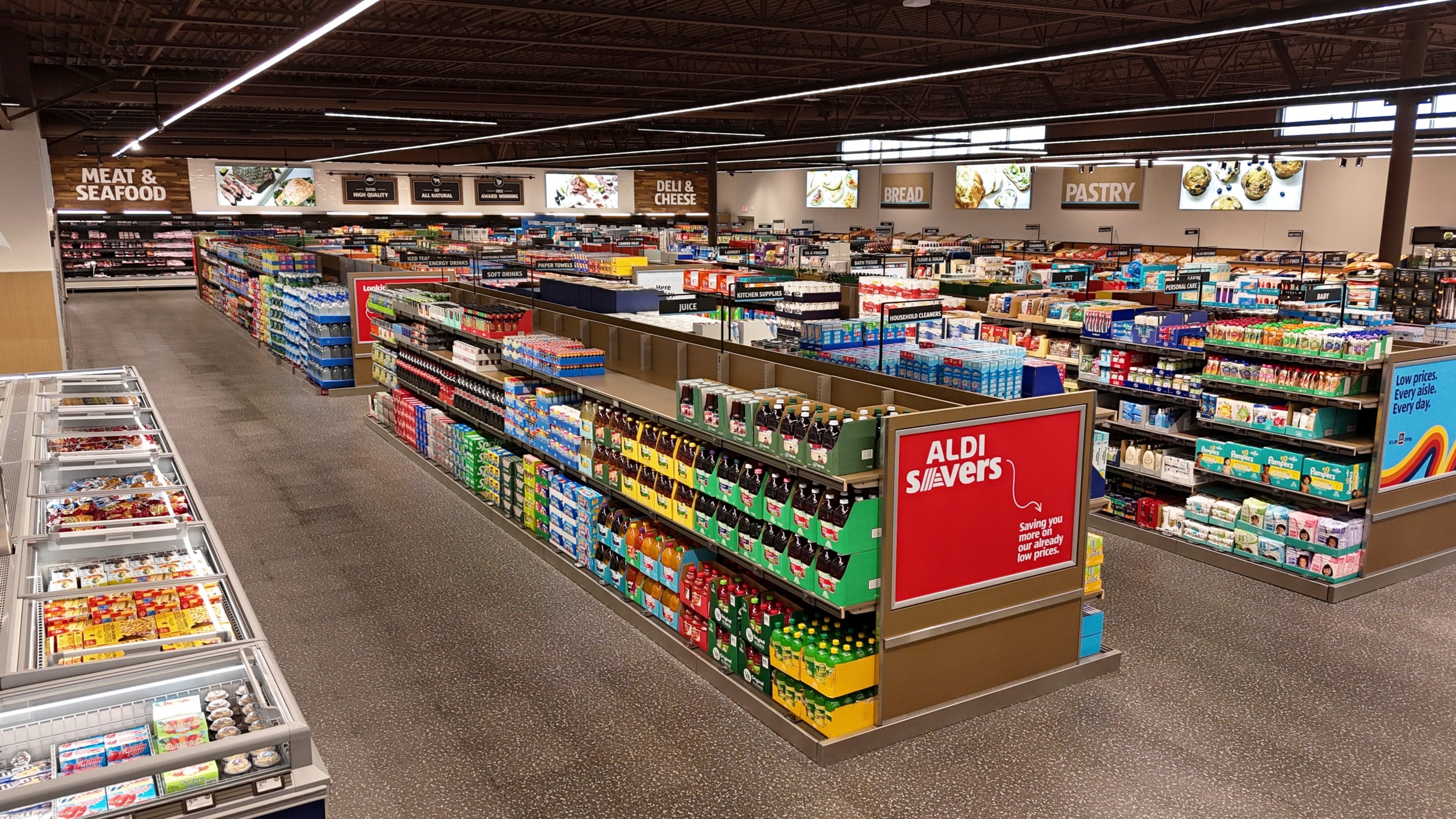 Aldi hebt sich von anderen US-Lebensmittelhändlern ab, die grosse, aufwendig gestaltete Märkte mit riesigem Sortiment, vielen Markenartikeln und breiten Gängen haben. In den ersten Filialen stehen weniger als 500 Artikel und fast ausschliesslich Eigenmarken. Aldi setzt dabei auf das Box-Store-Konzept. Die Waren werden schmucklos präsentiert – in den Kartons, in denen sie geliefert werden. Kunden müssen ihre Einkäufe selbst einpacken. Der Discounter überträgt sein deutsches Konzept nahezu unverändert.