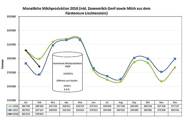 Im Februar wurden 278'442 Tonnen Milch eingeliefert, das sind 11'295 Tonnen oder 4.2 Prozent mehr als im Vorjahresmonat. Im Januar 2018 lag das Plus sogar bei 6.6 Prozent oder 18'607 Tonnen. Im Februar 2016 wurden 289'459 Tonnen produziert, 11'000 Tonnen mehr als im Februar 2018. Zu beachten ist, dass 2016 ein Schaltjahr war.