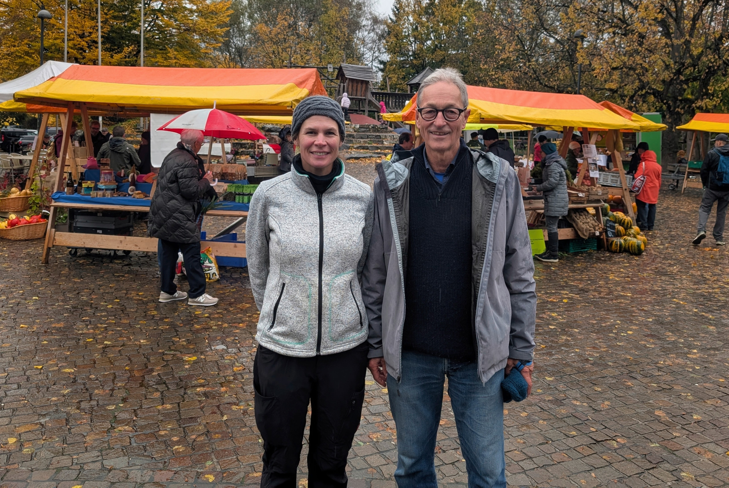 Katrin Portmann, Betriebsleiterin und Agronomin, sowie Ronald Fischer, pensionierter Agronom, vom Verein Aaretal Feldprodukte, am Erntedankfest in Münsingen.