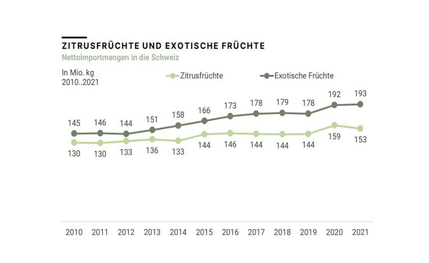 2021 wurden rund ein Drittel mehr exotische Früchte importiert als 2010. Zitrusfrüchte verzeichneten einen Anstieg von rund 18 %. Die mit Abstand bedeutendsten Produktgruppen waren Bananen und Orangen. Wachstumstreiber waren Avocados bei Exoten und Zitronen/Limetten bei Zitrusfrüchten. Die Früchte werden im Winter zur Konkurrenz für einheimische Äpfel.