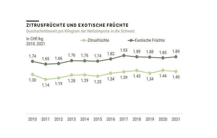 In der Schweiz haben von 2010 bis 2021 die Einfuhren von Exoten (+23 Mio. kg auf 153 Mio. kg) und Zitrusfrüchten (+48 Mio. kg auf 193 Mio. kg) deutlich zugenommen. Die mit Abstand bedeutendsten Produktgruppen waren Bananen (2020: 102 Mio. kg) und Orangen (2020: 74 Mio. kg). Neben den Mengen hat sich auch das Preisniveau von Zitrusfrüchten und exotischen Früchten in der betrachteten Periode erhöht.