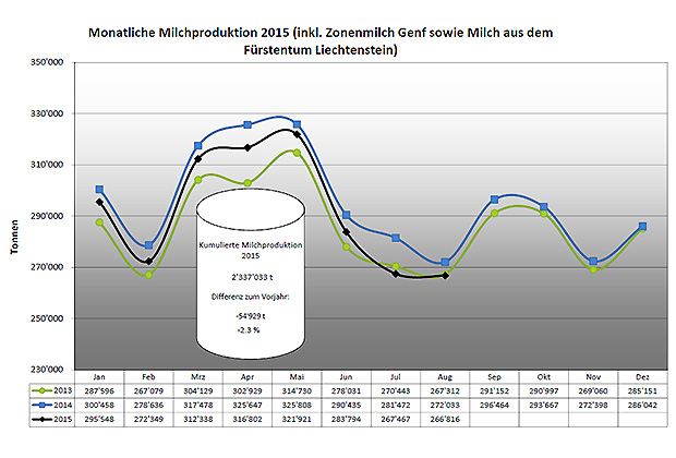 Die kumulierte Milchproduktion in den ersten acht Monaten dieses Jahres liegt um 2,3 Prozent oder 54‘929 Tonnen tiefer als in der Vorjahresperiode. Bis Ende August 2015 wurden gemäss TSM 2'337'033 Tonnen Milch erzeugt. Von Januar 2014 bis August 2014 lag die Produktion bei 2'391'962 Tonnen.