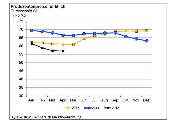 Die negative Preisspirale im Milchmarkt scheint kein Ende zu nehmen. Mit 56,96 Rp./kg liegt der nach Mengen gewichtete Produzentenmilchpreis auf dem tiefsten Stand seit Beginn der Erhebungen des BLW im Mai 1999. Seit Oktober 2014 zeigt der Preis bei der Milch immer gegen unten. Die Schallmauer von 60 Rp./kg wurde im Februar unterschritten.