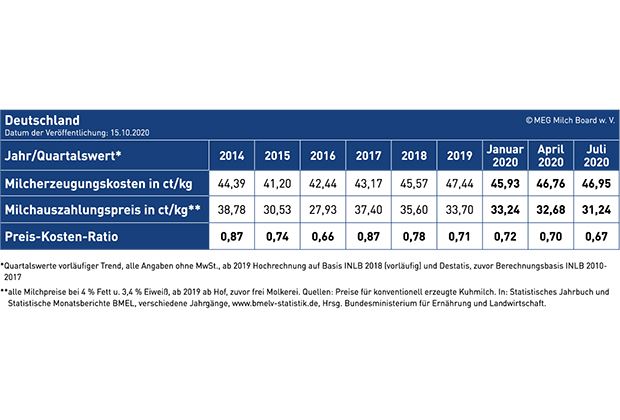 Im Vergleich zum Januar 2020 sind die Produktionskosten um über einen Cent gestiegen und betrugen im Juli 46,95 ct/kg (50,32 Rp.). Der Milchpreis sank um genau zwei Cent und lag Mitte 2020 bei nur 31,24 ct/kg (33,50 Rp.). Die aktuellen Ergebnisse zeigen eine deutliche Unterdeckung von 33%. Den Milchproduzentinnen und -produzenten fehlen demnach 15 Cent (16 Rp.) pro Kilogramm Milch um kostendeckend produzieren zu können.