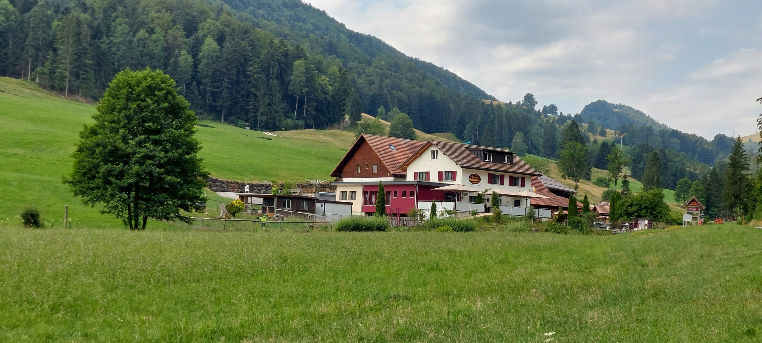 Das Gebiet rund um den Scheltenpass ist beliebt bei Tagesausflüglern, sei es zu Fuss, mit dem Töff, dem Velo oder dem Auto. Und hier, drei Kilometer von Ramiswil entfernt, am Fusse des Passes auf 750 m ü.M., steht der Sennhof Guldenthal. Dabei handelt es sich um eine Anordnung von drei gepflegten Gebäuden: einem Restaurant, einem Bauernhof und einer Remise.