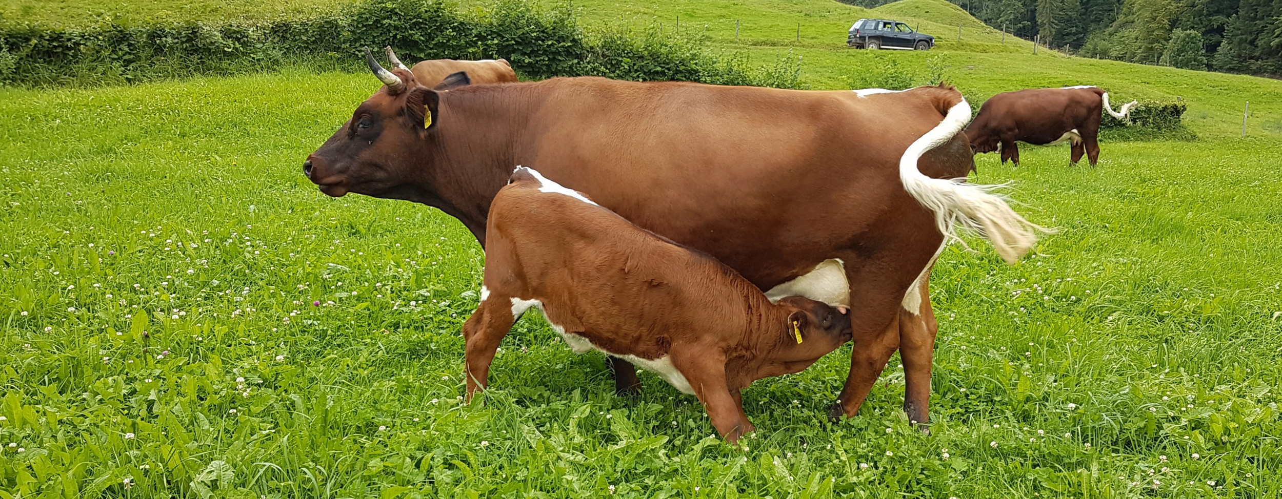 Zurück zu den Tieren: Eingestallt auf dem Hof sind Tux-Zillertaler-Kühe mit ihren Jungtieren. Dabei handelt es sich um eine seltene, robuste Rinderrasse aus Österreich, die ursprünglich aus dem Zillertal in Tirol stammt. Die Mutterkühe haben eine Widerristhöhe von etwa 125 bis 135 cm und wiegen 500 bis 600 Kilo. Stiere sind etwas grösser und rund 200 Kilo schwerer. Sie sind bekannt für ihre Robustheit und Anpassungsfähigkeit an raue Bergregionen. Das war ein wichtiger Aspekt bei der Wahl der Rasse. «Unsere Weiden sind grösstenteils hügelig, nass und sumpfig, schwerere Tiere würden das Land zu sehr beschädigen», erklärt Sandra Mächler.