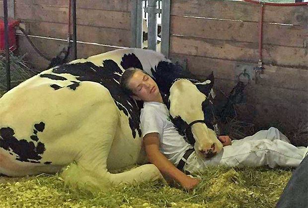 Das Bild von 15-jährige Mitchell Miner aus dem US-amerikanischen Williamsburg (Virginia) und seiner Kuh Audri verbreitet sich rasend in den Social Media. Der junge Mann und die Kuh ruhen sich nach einer Viehschau aus.