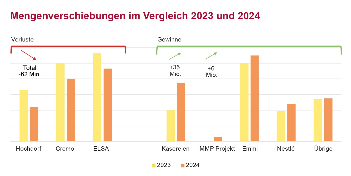 2024 hat Mooh gemäss Geschäftsbericht rund 598 Mio. kg Rohmilch verkauft, was in etwa der Menge des Vorjahrs entspricht. Die Milchmenge der Direktmitglieder belief sich auf 566,7 Mio. kg. Die Menge ist im Vergleich zu 2023 stabil geblieben. Im Durchschnitt hat Mooh im Jahr 2024 gemäss Geschäftsbericht 64,02 Rp./kg für Rohmilch bezahlt. Der Vorjahreswert lag bei 66,01 Rp./kg.