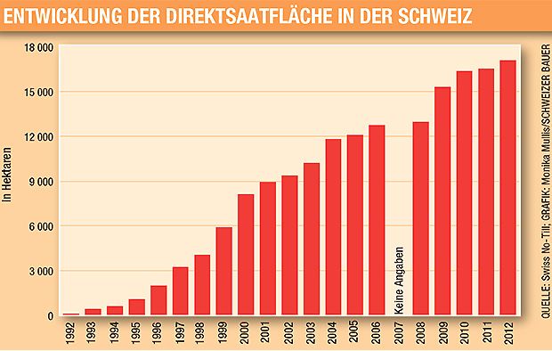 Dass immer mehr Landwirte auf Direktsaat setzen, zeigen Zahlen der Swiss-No-Till-Vereinigung: Die Direktsaatfläche hat sich von 1992 bis 2012 von 60 auf über 17'000 ha ver-x-facht. Dazu passt der Spruch von Bill Crabtree: «Jede Veränderung wird zuerst abgestritten, dann wird ihr vehement entgegengewirkt, schliesslich wird sie als selbstverständlich akzeptiert.»