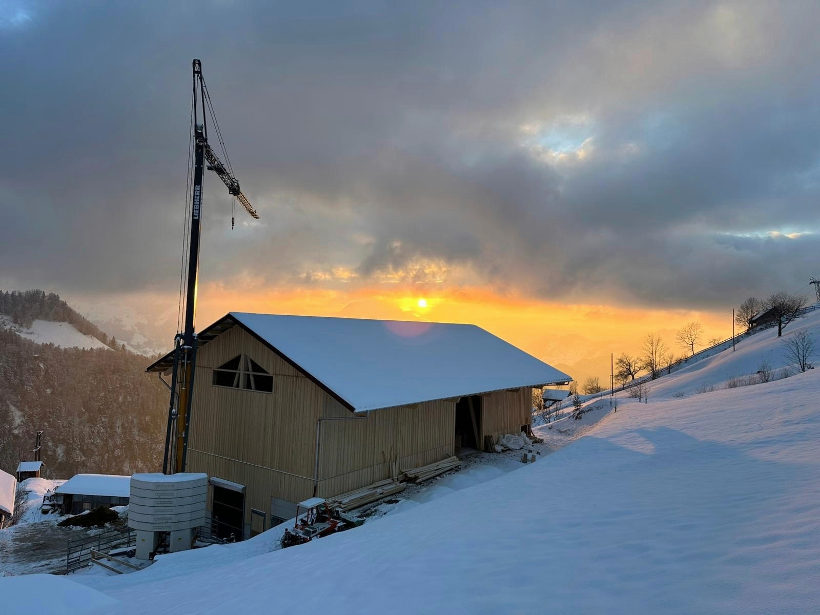 Für Mischa Hofer und seine Partnerin Nadja Trachsel ist es ein schönes Weihnachtsgeschenk: Der alte Stall ist abgerissen, der neue steht. Als symbolische Krönung kamen kurz nach der Fertigstellung die Chlausejäger von Vitznau vorbei. Mit ihren Treicheln vertreiben sie böse Geister – also halten nach traditioneller Auffassung Negatives fern. Und was «negativ» bedeutet, weiss Hofer nur zu gut.