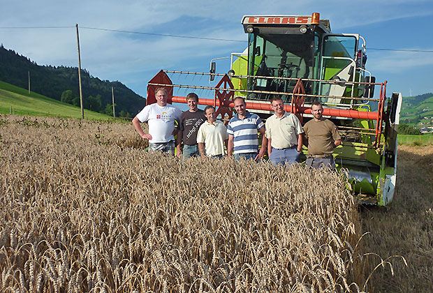 Am Samstag vor einer Woche konnte nun der Entlebucher Weizen mit dem Mähdrescher geerntet werden – trotz der nassen Bodenverhältnisse, welche den Mähdrescher-Fahrer Michael Fankhauser herausforderten. Mit grosser Freude wohnten Müller Guido Wicki und einige Schüpfheimer «Getreide-Bauern» dem Spektakel bei. Viktor Zihlmann vertrat die Biosphären-Bäckerpartner, welche aus dem Weizen ein Echt-Entlebuch-Brot kreieren werden, sobald dieser gelagert und in der Wicki-Mühle in Schüpfheim zu Backmehl vermahlen ist.