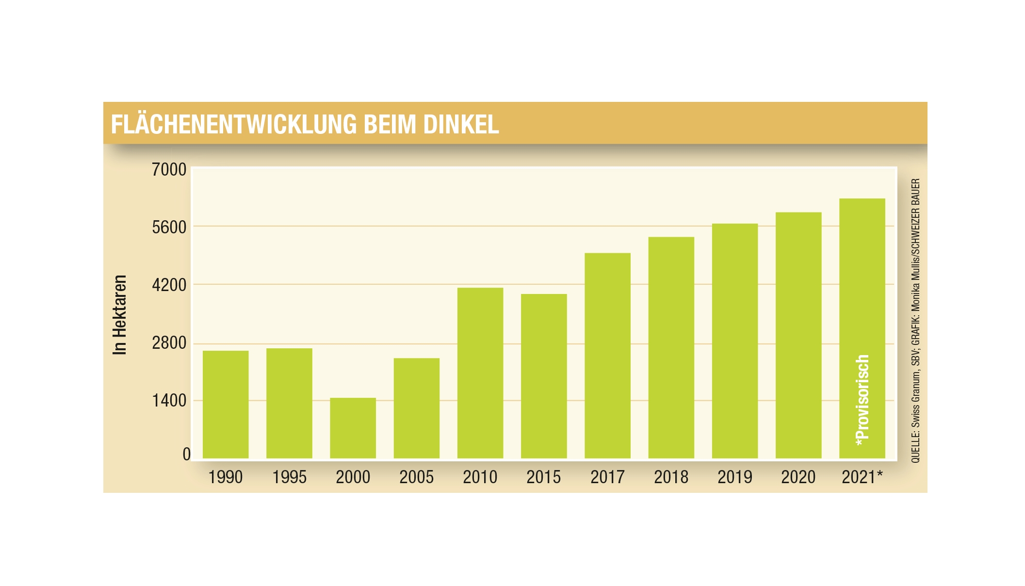 Die Schweizer Dinkelfläche hat in den letzten Jahren stetig zugenommen (siehe Grafik). Im Jahr 2000 wurde noch auf knapp 1500 Hektaren Dinkel angesät. Zehn Jahre später waren es bereits 4100 Hektaren, und noch einmal zehn Jahre später (2020) hatte sich die Fläche vervierfacht (knapp 6000 Hektaren).