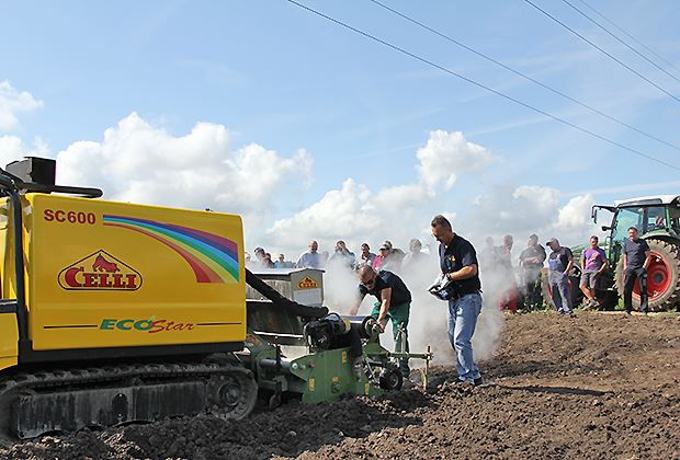 Die Dampffräse Bioflash der Firma Celli wurde für den Einsatz im Treibhaus konzipiert. Mit einer Arbeitsbreite von 150cm bereitet die GPS-gesteuerte Fräse die Beete für den Biogemüsebau vor. Der Boden wird im bearbeiteten Bereich auf 70 Grad erhitzt, um die Unkrautsamen keimunfähig zu machen.
