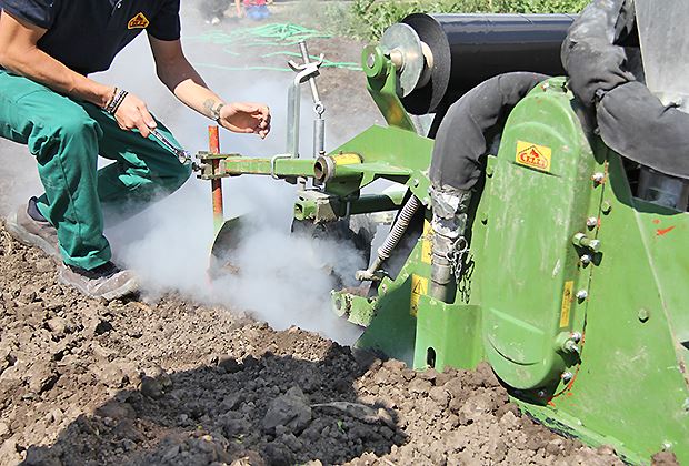 Bei der langsam rotierenden Fräse strömt auf 28 und 20cm Tiefe Dampf ein, der den Boden durch Zugabe von Branntkalk auf 70 Grad erhitzt. Danach wird der Boden mit einer schwarzen Folie abgedeckt, um die Temperatur möglichst lange zu halten, damit die Mandeln im Boden keimunfähig gemacht werden können.