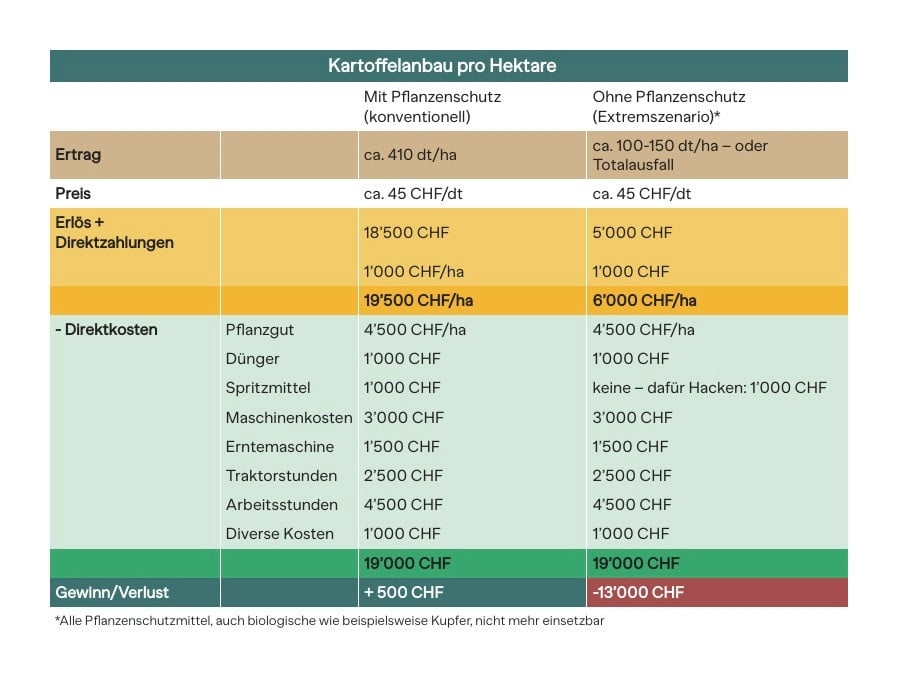 Was der Verlust der Pflanzenschutzmittel in der Praxis bedeutet, erklärt Landwirt und Agronom Thomas Steiner auf Anfrage. Seine Familie baut seit vielen Jahren Kartoffeln an. «Kartoffeln sind extrem anfällig für die Kraut- und Knollenfäule, eine Pilzkrankheit – ohne Fungizide kann ein ganzes Kartoffelfeld innerhalb weniger Tage komplett absterben», sagt er. Landwirte gehen mit hohen Investitionen in Vorleistung: Sie müssen Saatgut, Dünger und Pflanzenschutzmittel kaufen und auch Kosten für Maschinen kommen dazu.