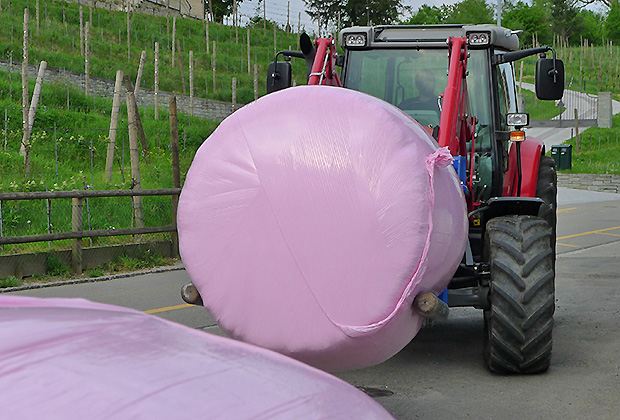 Siloballen verpackt in pinker Folie? Das gibt es tatsächlich! Seit diesem Jahr gibt es dieses Produkt des schwedischen Herstellers Trioplast auch in der Schweiz zu kaufen. Und in einigen Orten wurde die Folie bereits eingesetzt. Aufmerksamkeit ist damit garantiert, zudem sorgt die Farbe für Abwechslung. Die helle Folie gewährleistet gemäss Trioplast eine gute Ballensilagequalität. Und die spezielle Farbe dient erst noch einem guten Zweck.